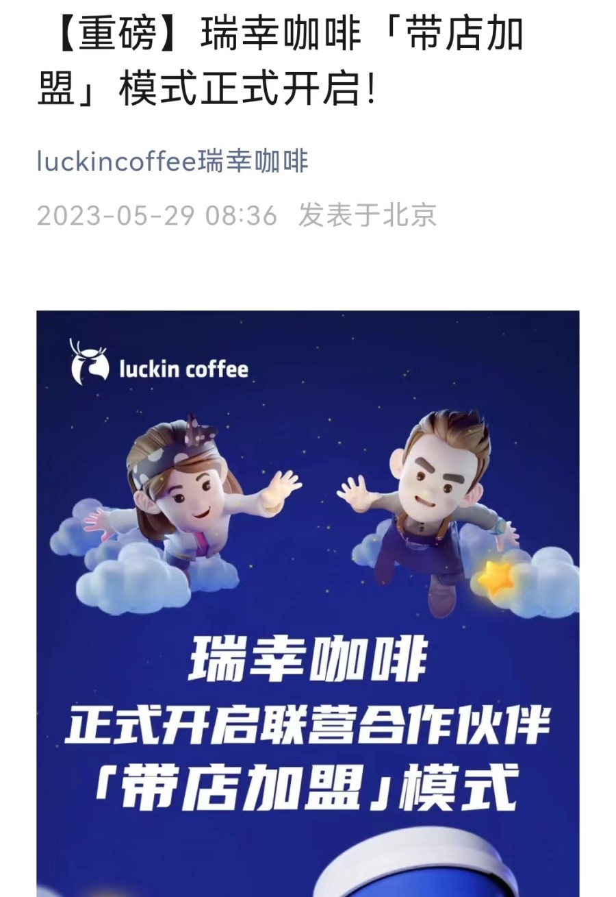 2023年5月29日,瑞幸咖啡正式官宣开启“带店加盟”模式。该模式是以联营合作模式为基础,面向租赁合同期内正在经营的店铺或自有产权商铺的投资者推出的新联营合作方式,加盟商需满足拥有租赁合同期内正在经营的商铺,或自有产权商铺等条件。
