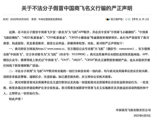 6月8日,中国商飞发布《关于不法分子假冒中国商飞名义行骗的严正声明》称,近期,有不法分子假冒中国商飞开发一款名为“大飞机”APP程序,并在其中发布“中国商飞小额期权”、“中国商飞股份期权”、“ARJ21私募基金”、“C919私募基金”、“CR929小额基金”等虚假投资理财项目。此行为严重侵害了公司商誉,构成侵权,更是蓄意欺诈,损害公众利益,涉嫌刑事犯罪。对此,公司特严正声明如下: