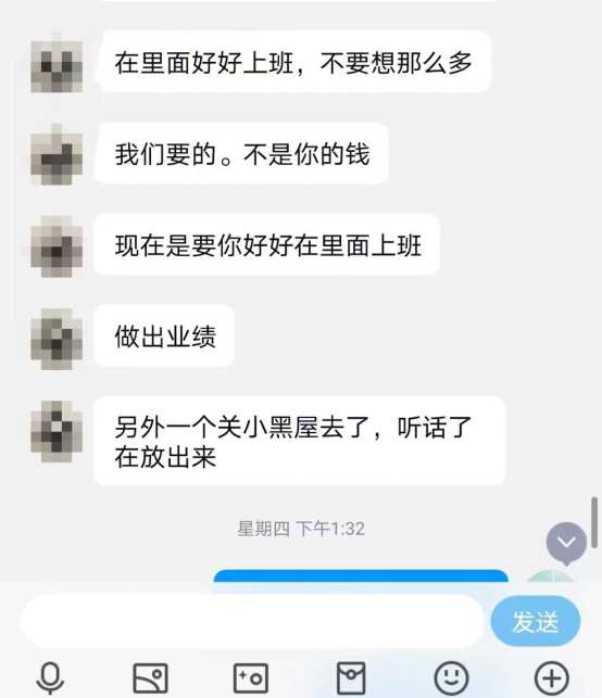 “有专门从境内拉人过去缅甸的中介,他们都被统一称为‘舌头’。”肖女士根据肖磊提供的线索总结称。她还向正观新闻记者展示了肖磊与“舌头”的聊天记录截图,“舌头”曾威胁肖磊“在里面好好上班,不要想那么多”还表示要肖磊“做出成绩”并声称“另外一个关小黑屋去了,听话了再放出来。”