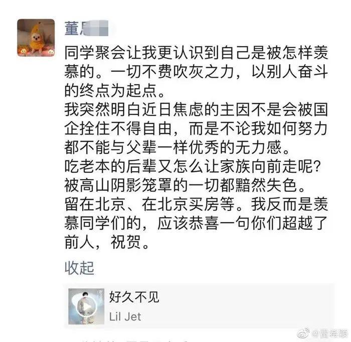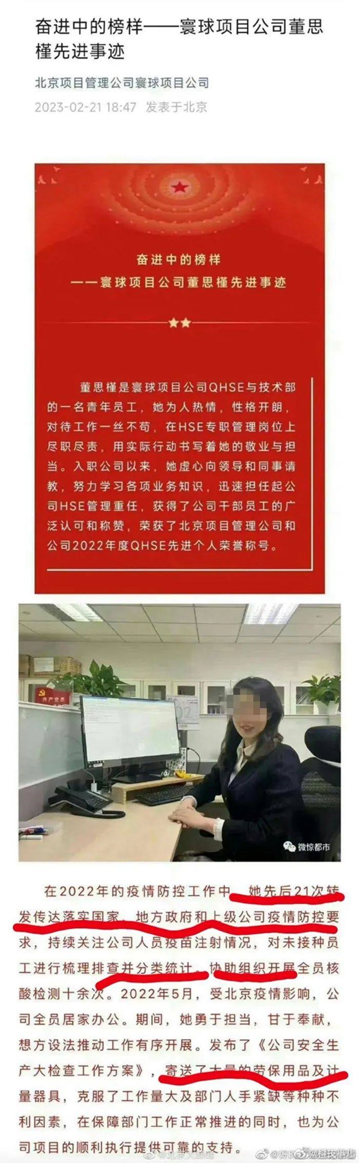 网友截屏疑似董某某个人社交账号。据上游新闻报道,其记者在网上搜索发现,网友晒出的疑似董某某个人社交账号炫富的内容包括并不仅限于“一切不费吹灰之力,以别人奋斗的终点为起点”“两个淘宝账号花了106万”“收拾了仨礼拜终于妥帖了,新家”“上周无油祖母绿,这周老铺大号玫瑰花窗,终于一套毕业”“谢谢Tiffany,钻戒有了新目标”等。如果上述内容属实,那么网友不禁质疑,这些大额开销来源是哪?贵重商品是否为自己或家庭的合法收入购入?和涉事国企原高管有无瓜葛?若有瓜葛,那么这些钱财来源是否合法? 在2月份,“北京项目管理公司寰球项目公司”公众号发布的《奋进中的榜样——寰球项目公司董思瑾先进事迹》一文中称,董某某评为公司2022年度QHSE先进个人荣誉称号。董某某都有哪些先进事迹呢?文中称,“她先后21次传达落实国家、地方政府和上级公司疫情防控要求,持续关注公司人员疫苗注射情况”“组织开展全员核酸检测十余次”“发布了《公司安全大检查方案》,寄送了大量的劳保用品及计量器具”等。 很多网友有疑问:就这?未免有点太轻松了吧,这就能获得公司先进个人?所以该公司评先进个人的标准和管理标准是什么? 7日有媒体报道,“北京项目管理公司寰球项目公司”微信公众号已将胡继勇有关的推文删除,但删除时间不明。中新财经7日再度查询该账号,发现账号已自主注销。 此外,其上属公司“中国石油北京项目管理公司”官方微信公众号也已将涉及胡继勇的推文删除。