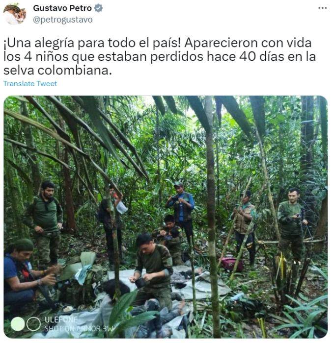 据路透社报道,佩特罗在社交媒体推特上写道:“整个国家的欢乐!在哥伦比亚丛林中失踪的4个孩子被发现还活着。”