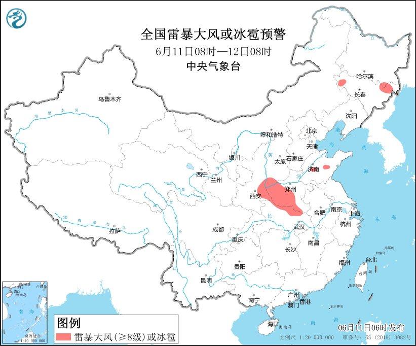 预计6月11日08时至12日08时,吉林东部和西北部、陕西东南部、山西南部、山东中部、河南中西部和南部、湖北北部等地的部分地区将有8-10级雷暴大风或冰雹天气;内蒙古东部、吉林东部和西北部、辽宁东部和西南部、新疆北疆北部和伊犁河谷、陕西东南部、河北东北部、山东中南部、河南南部和西部、湖北北部和东部、福建东南部、云南西南部、广东西南部和东部沿海、海南岛东北部、台湾岛北部等地的部分地区将有短时强降水天气,小时雨量20-40毫米,局地可达60毫米以上。