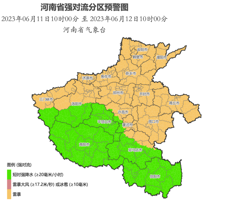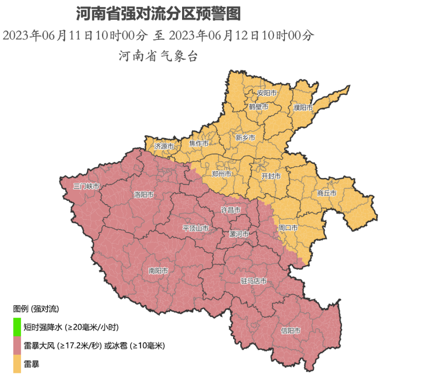 河南省气象台6月11日10时00分发布强对流蓝色预警:预计6月11日10时至12日10时,三门峡、洛阳、郑州西部、平顶山、许昌、漯河、周口西部、南阳、驻马店、信阳大部分县市将出现8-10级雷暴大风,部分县市伴有短时强降水(小时雨量30-45毫米),局地冰雹。请密切关注属地气象部门发布的最新预报信息和气象灾害预警信号,做好防范应对工作。上述地区的相邻县市(区)也需关注。