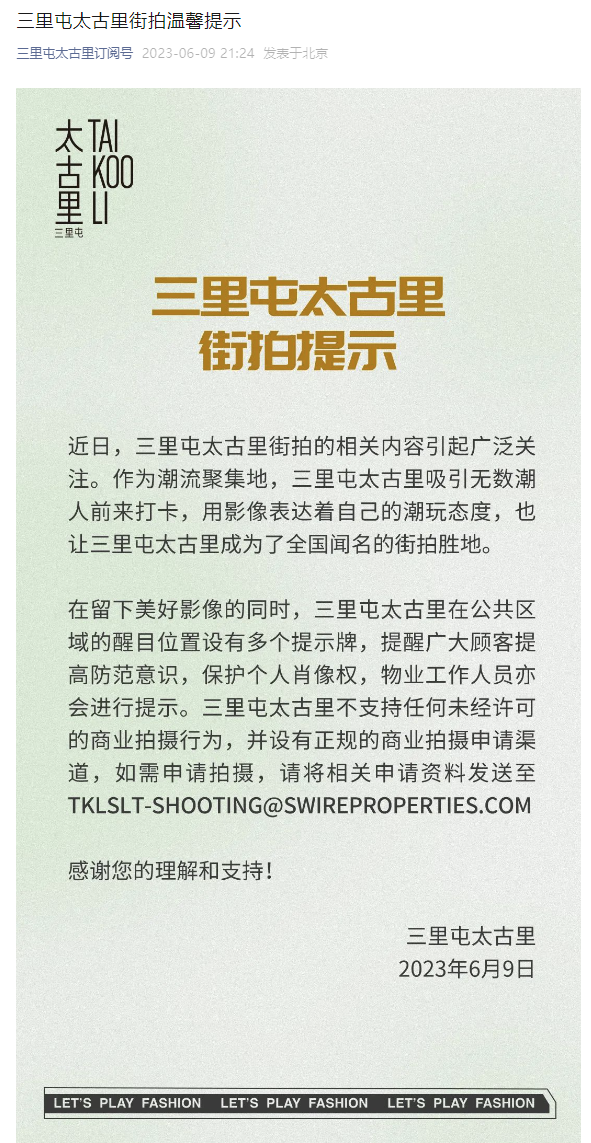 北京三里屯太古里发布“街拍提示”:三里屯太古里在公共区域的醒目位置设有多个提示牌,提醒广大顾客提高防范意识,保护个人肖像权,物业工作人员亦会进行提示。三里屯太古里不支持任何未经许可的商业拍摄行为,并设有正规的商业拍摄申请渠道。