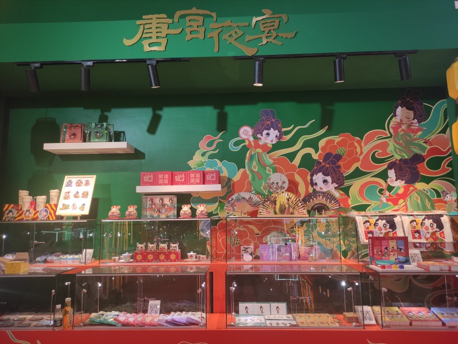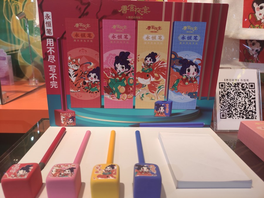 该公司副总经理胡志强介绍,“唐宫夜宴”主题展区是华冠文化的重点展示内容。该舞蹈虽已演出多年,仍热度不减,是名副其实的“流量密码”。华冠文化参照原版舞蹈服饰配色设计整体柜台,展示盲盒、咖啡杯、冰箱贴、陶瓷玩偶等众多周边文创。其中,盲盒系列产品备受欢迎,全网各销售渠道几近断货,据不完全统计,目前已销售12万个。在6月10日、11日的文博会公众开放日,更有不少参观者询问、购买唐宫夜宴周边文创产品。