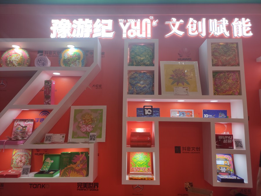 在郑州展馆“豫游纪·文创赋能IP联名”展区,陈列着河南赏豫文化创意有限公司为抖音、字节跳动、比亚迪等品牌设计的文创产品。赏豫文化总经理王鹏辉介绍,在为客户设计礼品、伴手礼、企业周边时,赏豫文化始终坚持以创新美学设计为宗旨,实现东方文化自我美学价值的世界表达,向世界传递中国文化中的希望力量。
