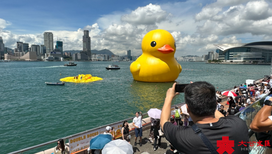 昨日,“橡皮鸭二重畅”在香港维多利亚港中西区海滨长廊举行预览日暨启航礼。此次大黄鸭展期将视天气等情况而定,预计为期约两周。
