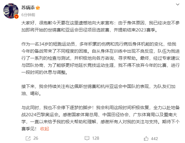 大家好,很抱歉今天要在这里遗憾地向大家宣布:由于身体原因,我已经决定不参加即将开始的世锦赛和亚运会田径项目选拔赛,并提前结束2023赛季。