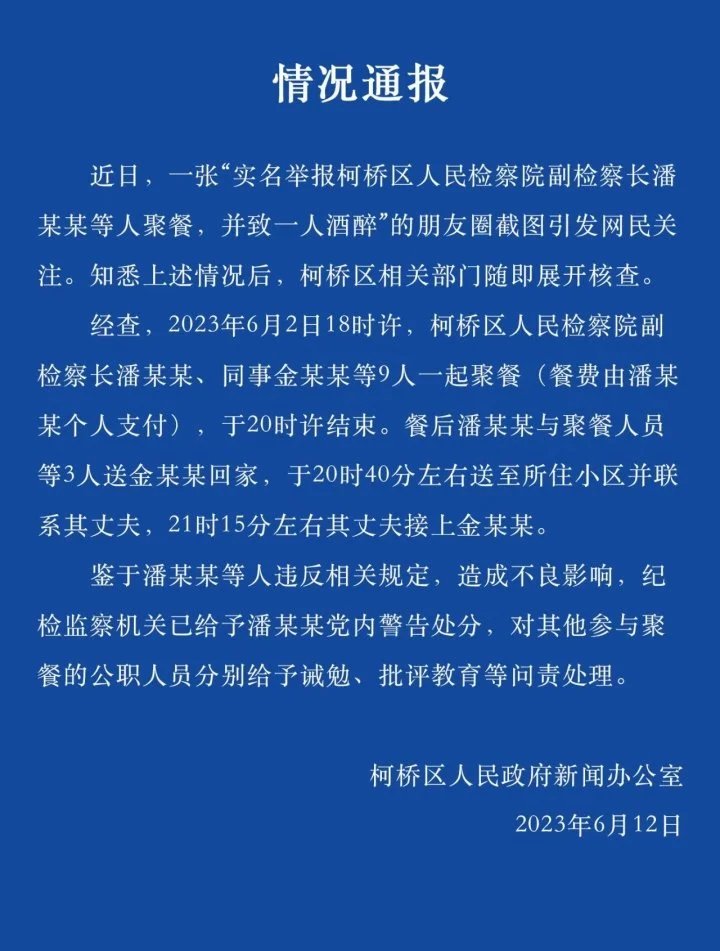 经查,6月2日18时许,柯桥区人民检察院副检察长潘某某、同事金某某等9人一起聚餐(餐费由潘某某个人支付),于20时许结束。餐后潘某某与聚餐人员等3人送金某某回家,于20时40分左右送至所住小区并联系其丈夫,21时15分左右其丈夫接上金某某。