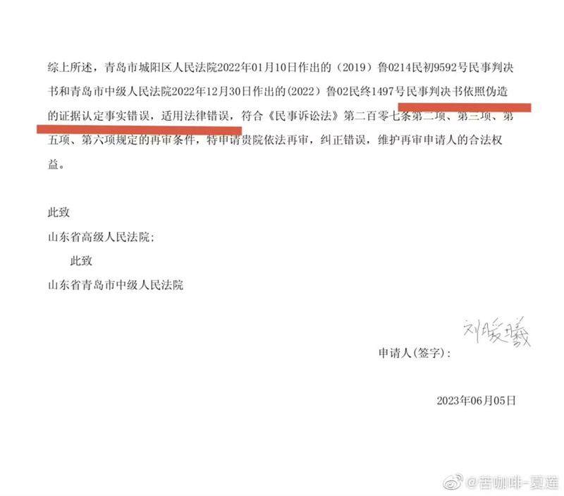 记者通过江秋莲的微博看到,刘鑫的再审申请于今年 6 月 5 日作出,其中提到 "…… 青岛市中级人民法院 2022 年 12 月 30 日作出的(2022)鲁 02 民终 1497 号民事判决书依照伪造的证据认定事实错误,适用法律错误 …… 特申请贵院依法再审,纠正错误,维护再审审请人的合法权益。"