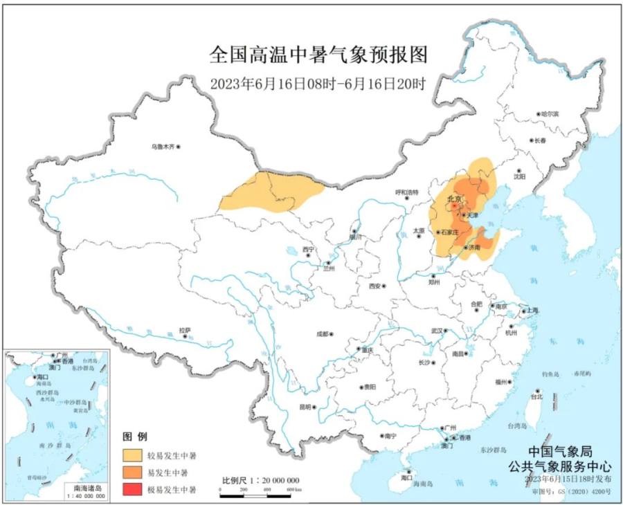 根据预报,6月16日白天,北京、天津、河北、辽宁西部、山东中北部、内蒙古西部和东南部、甘肃西北部等地较易发生中暑事件。其中,北京东南部、天津中西部、河北东部、辽宁西南部、山东北部、内蒙古东南部等地的部分地区易发生中暑事件。