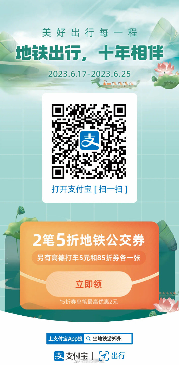 6月17日~6月25日,将通过支付宝向乘客派发2笔5折优惠券礼包,搭乘郑州地铁等公共交通时可享受2次5折出行(单笔优惠最高2元)。活动期间,搭乘郑州地铁时使用支付宝乘车码,不仅可以享受出行优惠,还可以拥有端午专属出行皮肤。