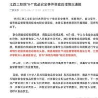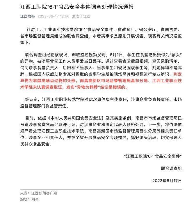 6月17日,江西工业职业技术学院“6·1”食品安全事件调查结果公布。联合调查组经勘查现场,调取监控视频发现,6月1日,学生在食堂吃出疑似为“鼠头”的异物不是鸭脖。根据国内权威动物专家对提取的当事学生所拍现场照片和视频进行专业辨识,判定异物为老鼠类啮齿动物的头部。南昌高新区市场监督管理局昌东分局、江西工业职业技术学院未认真调查取证,发布“异物为鸭脖”结论是错误的。