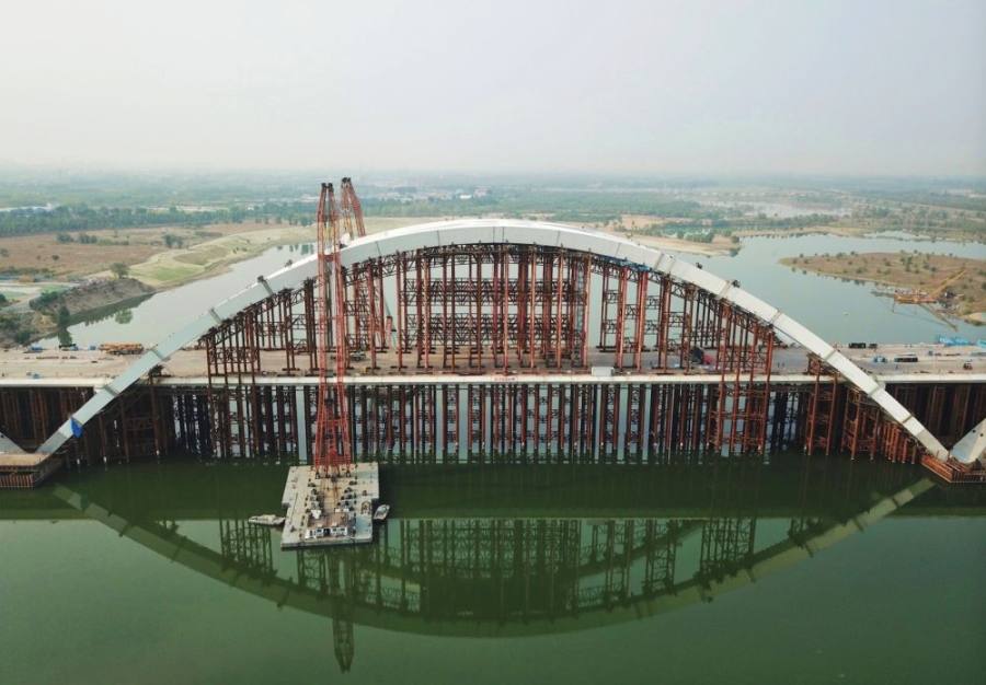 据中铁上海工程局京雄大桥分部总工程师高林龙介绍,京雄大桥主桥桥梁采用飞燕式拱桥结构,桥梁拱肋和主梁均采用钢结构设计。