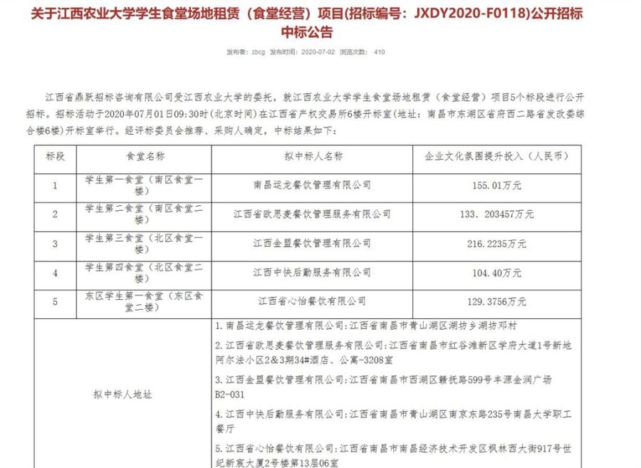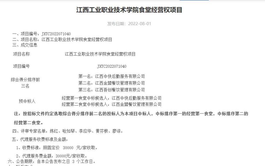 公开信息显示,江西农业大学学生第四食堂经营项目中标人同样也是江西中快后勤服务有限公司。