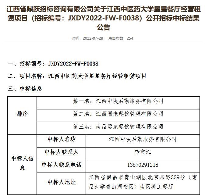 公开资料显示,2022年江西中西药大学星星餐厅经营租赁项目中标人为江西中快后勤服务有限公司。