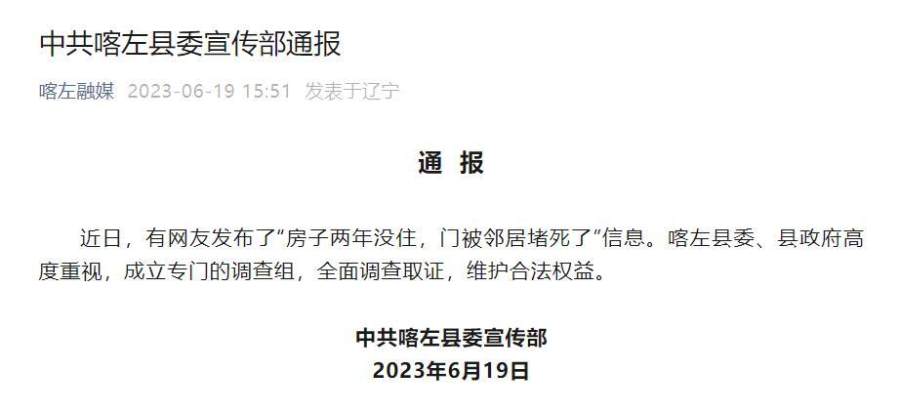 6月19日下午,就辽宁一女子房门被邻居堵死一事,中共喀左县委宣传部发布通报,内容如下:近日,有网友发布了“房子两年没住,门被邻居堵死了”信息。喀左县委、县政府高度重视,成立专门的调查组,全面调查取证,维护合法权益。