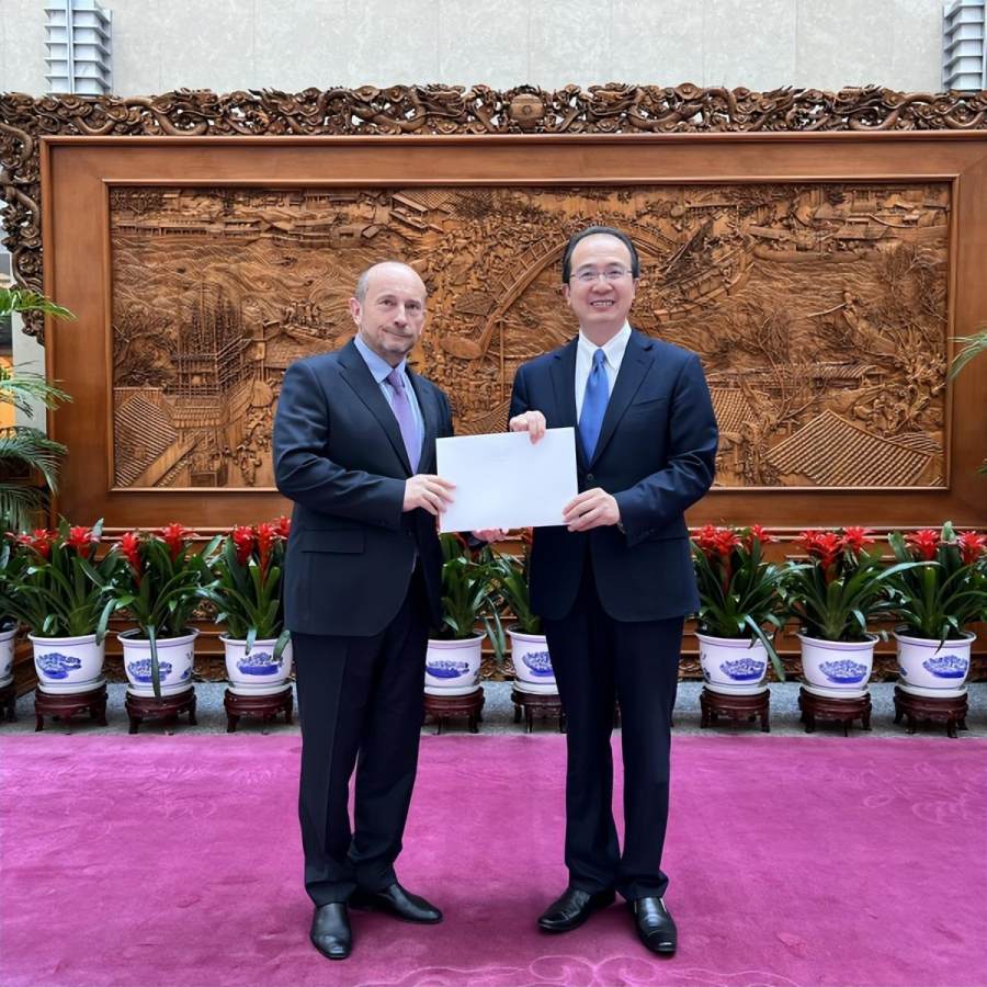 2023年6月20日,外交部礼宾司司长洪磊接受乌克兰新任驻华大使里亚比金递交的国书副本。里亚比金大使于6月14日抵华。