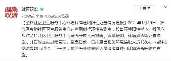 2021年1月19日,成都双流区金桥社区卫生服务中心在每周例行环境监测中,检出环境阳性样本。双流区立即对金桥社区卫生服务中心全面开展人员排查、采样检测、环境消杀等处置措施,并暂时实施封闭管理。截至目前,已排查出相关环境接触人员158人,核酸检测结果均为阴性。下一步,双流区将继续做好人员健康管理和环境消杀等防控措施。