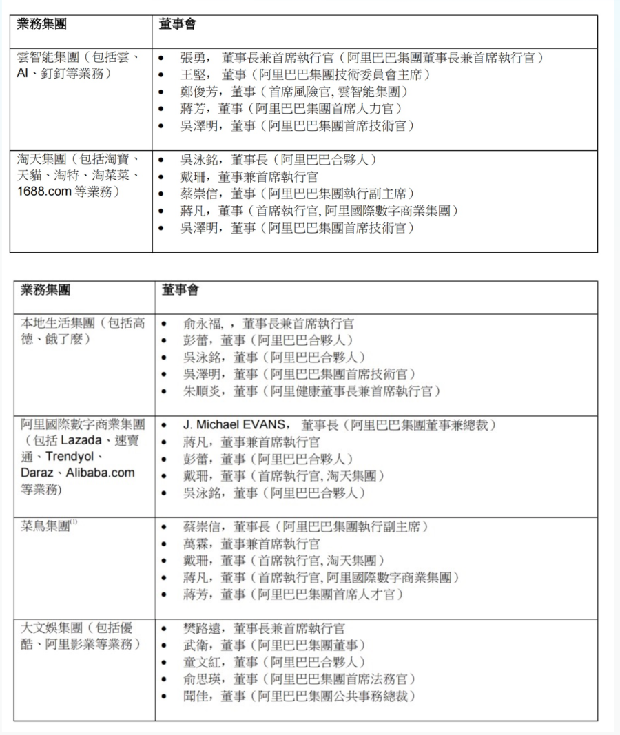 阿里巴巴集团董事会批准的六大业务集团的董事会名单