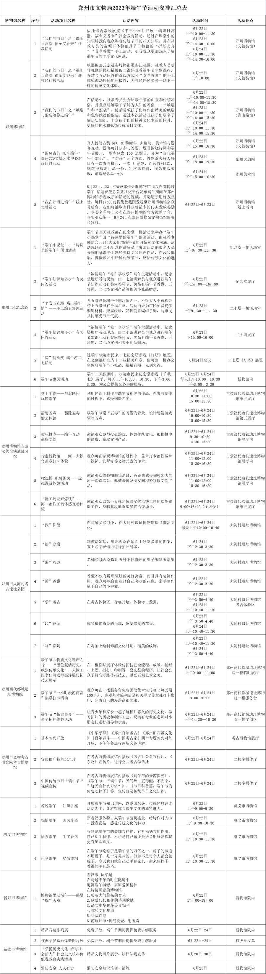 记者从郑州市文物局获悉,为给市民假日出游提供好去处,全市多家文博场馆将举办丰富多彩的文博活动,为市民奉献多彩的假日文化大餐。相关活动一览表如下: