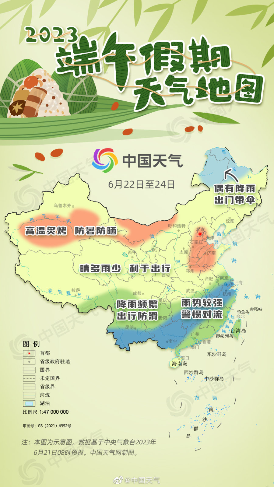 根据中国天气网推出的端午假期天气地图来看,端午期间,京津冀、河南、山东、内蒙古及新疆等地将经历高温“炙烤”,部分地区最高气温可达到39℃以上,有外出计划的小伙伴要注意防暑防晒;江南大部、云贵高原、华南西部将遭遇大范围持续性强降雨过程,尤其是湖南中南部、湖北东南部、江西中北部、安徽南部、浙江中北部、广西中北部等地的部分地区有大暴雨,局地有特大暴雨,并伴有雷暴大风等强对流天气,大家出游要避开降雨较强或强对流时段,并随身携带雨具,注意交通安全。