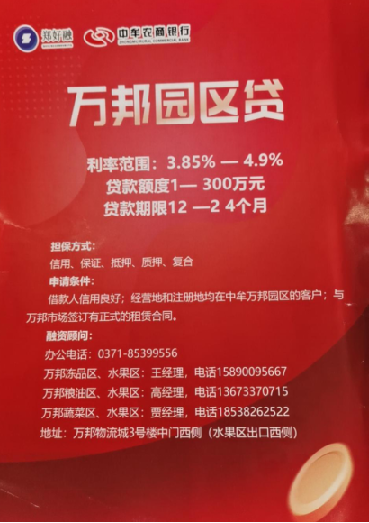 万邦物流园内的中牟农商银行今年6月份刚刚上线了“万邦园区贷”产品,工作人员透露,上线以来,已经获得了园区内30多户商户的支持,总贷款额度超过1800万元。