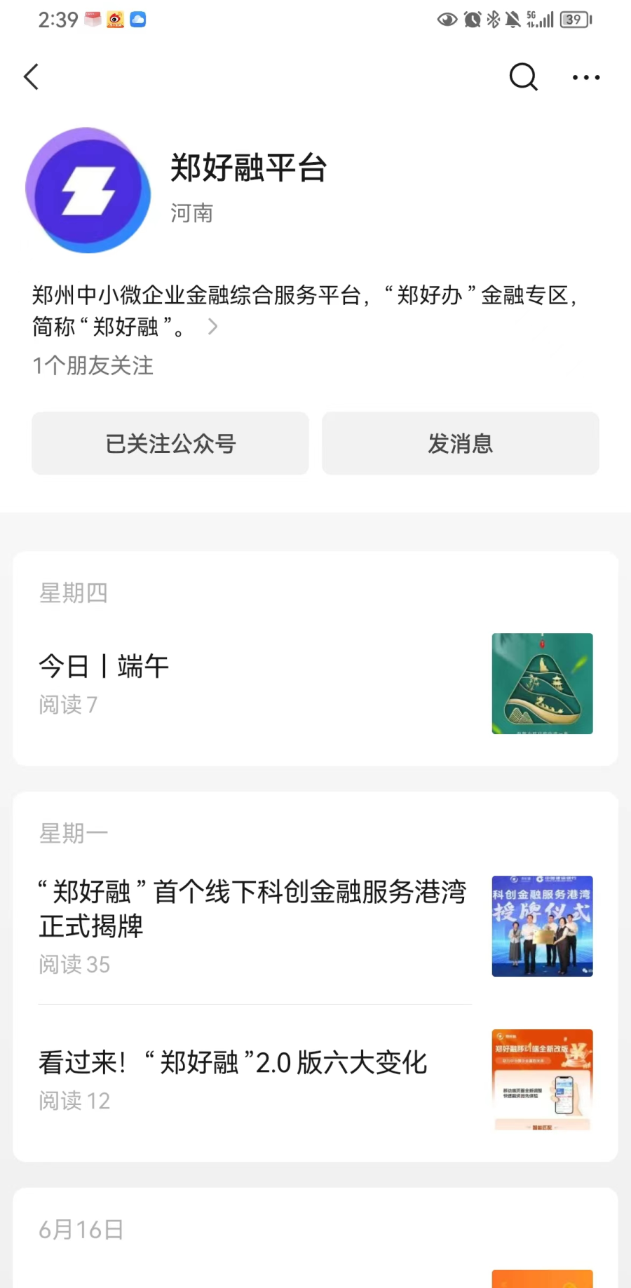 2.打开微信,搜索关注“郑好融平台”公众号,可留言咨询。