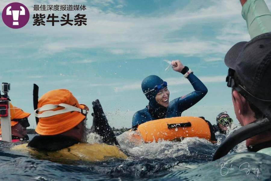 “从下潜开始我的感官就模糊了,眼睛看不清,耳朵听不清,我可以清楚地感受到我的心跳,一切就像是做梦一样。”她笑称自己像是中了自由潜水的“毒”,从2012到2017年,她和大多数爱好者一样,去世界各地的海岛潜水,贪婪地享受大海带来的快乐,“我们以自由潜的形式进入大海,与那些海洋生物互动,它们会对你很好奇,有些鲸鱼宝宝甚至会来到你身边,近距离地看看你、触碰你。如果我们携带气瓶的话,冒出的泡泡会让那些海洋生物不敢接近。”徐童彤想起,自己曾经在海里看到长达十几米的鲸鲨,非常震撼,“我们只是海里的‘客人’,在海洋里,我们是那么渺小。”