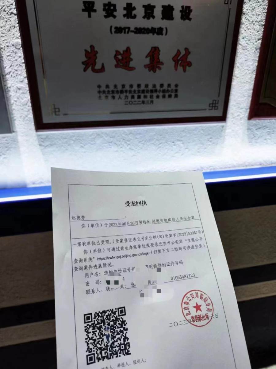 赵德芳介绍,该威胁电话发生在6月26日下午3点多,随后他来到北京市公安局朝阳分局常营派出所报案,由于吴丹红没有到场,警方受理了“赵德芳被威胁人身安全案”。6月26日下午,朝阳公安刑警队打电话过来进一步询问了相关情况。