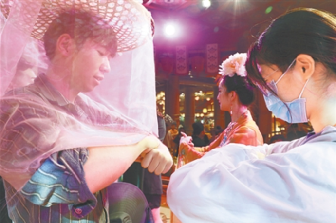在郑州唐宫夜宴景区内,香港学子与河南学子相互学习 郑报全媒体见习记者 王梦瑶 摄