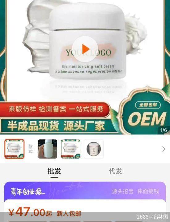 比如,在1688批发平台,一个店铺出售的海蓝谜面霜只卖47元,同款正品官方售价4520元。赫莲娜黑绷带面霜也是重点复刻对象,同平台另一个店家所谓“新版赫莲娜黑绷带面霜50ml”,官方售价3780元,店里只卖32元,量大更便宜。