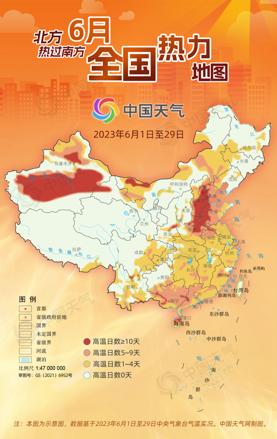 不仅仅是端午期间,进入6月以来北方高温是一轮接着一轮,从中国天气网发布的全国6月高温热力地图可以看出,截止到6月29日,高温日数在10天以上的地区主要出现在华北、黄淮和新疆地区,在地图上已经红成一片。而南方大部高温日数都在10天以下,尤其是江南和华南北部等传统火炉地区,整个6月高温日数多在5天以下,难怪华北地区小伙伴喊着要去南方避暑了。