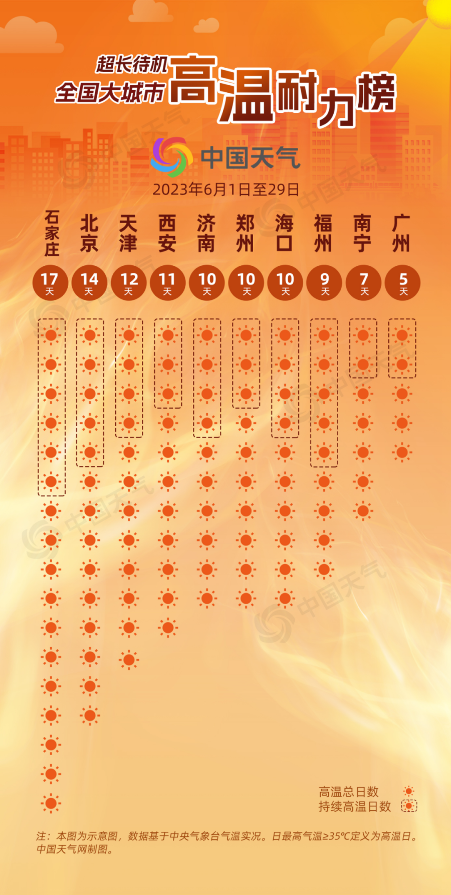 从中国天气网全国大城市高温耐力榜可以看出,京津冀华北三兄弟携手登上榜单前三名。其中,石家庄以17天拔得头筹,北京以14天位列第二,两个城市都打破了当地6月高温日数最多纪录。并且根据最新实况显示,今天(30日)石家庄、北京依然达到高温,也就是这两个城市半个月最高气温都超过了35℃。