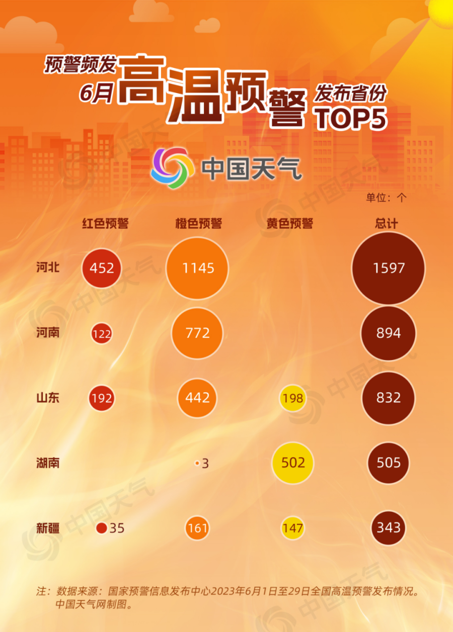 高温天气会给公众生产生活造成诸多影响,高温中暑、热射病等威胁人体健康,也会给当地电力部门造成供电压力。为应对高温热浪可能带来的各种不利影响,各级气象部门频频拉响预警。据国家预警信息发布中心统计,进入6月以来,国家级高温预警发布21个,其中4个达到橙色级别。从各省区市发布情况来看,河北、河南、山东、湖南、新疆为高温预警发布总数的前5名,其中河北最为突出,红色预警就达到了452个。