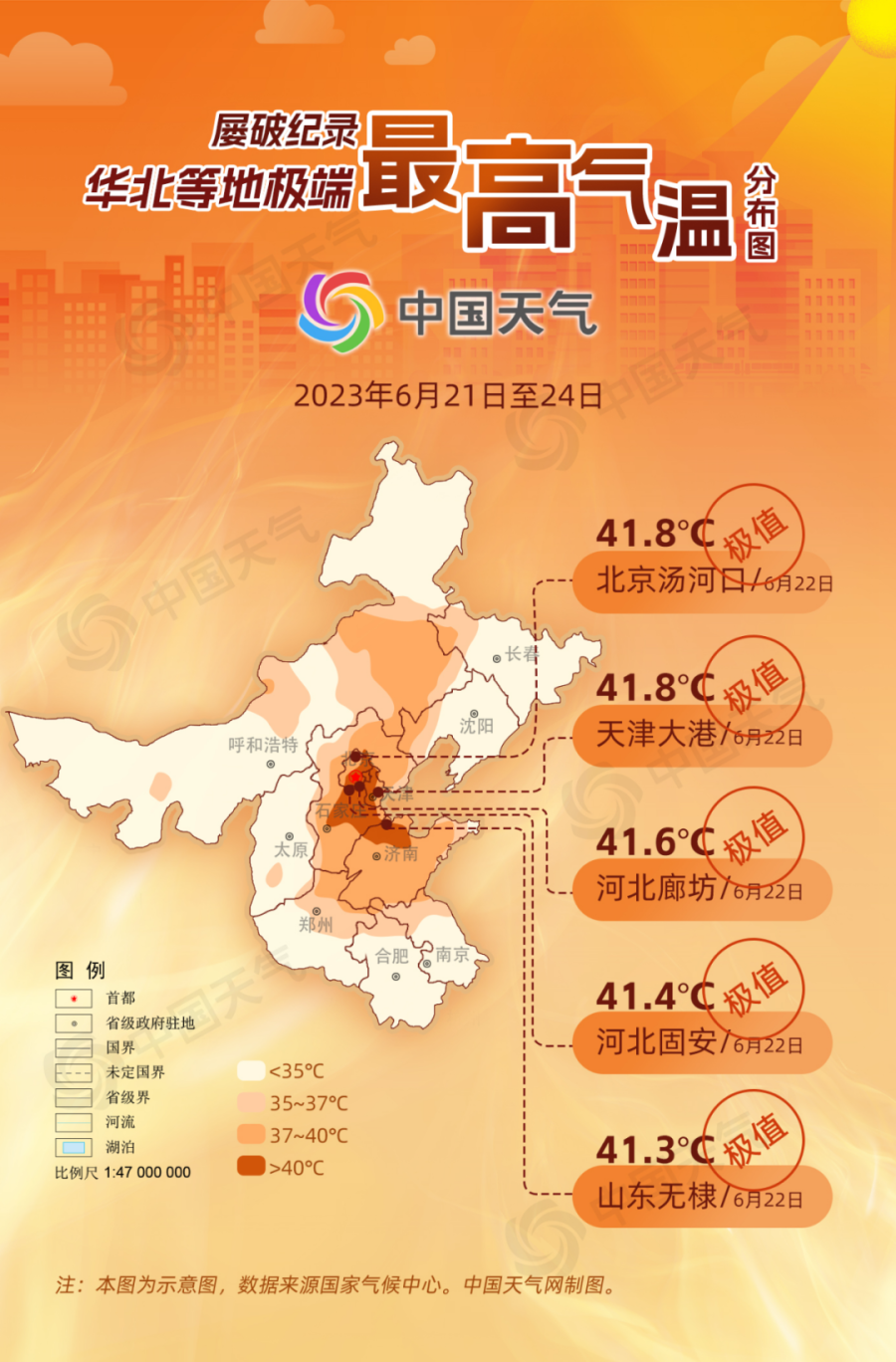 此次高温过程,共有80个国家气象站达到极端高温值,其中北京汤河口、天津大港、河北廊坊、固安、山东无棣等23个国家气象站突破历史极值,刷新了当地高温纪录。国家气候中心认定此次高温过程综合强度为今年以来最强,极端性是近10年来6月最强。