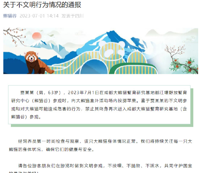 贾某某(男,63岁),2023年7月1日在成都大熊猫繁育研究基地都江堰野放繁育研究中心(熊猫谷)参观时,向大熊猫室外活动场内投掷苹果。鉴于贾某某的不文明参观和对大熊猫可能造成危害的行为,禁止其终身再次进入成都大熊猫繁育研究基地(含熊猫谷)参观。