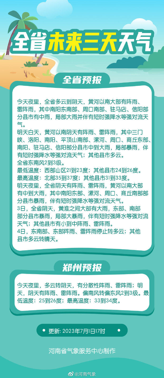 7月1日夜里,全省阴天,三门峡、洛阳、平顶山、郑州南部、许昌、漯河、周口、商丘、南阳、驻马店、信阳有阵雨、雷阵雨,其中南阳东南部、驻马店南部、信阳部分县市有中到大雨,局部暴雨并伴有短时强降水等强对流天气。 全省偏南风3级左右。 最高温度:北中部35到37度;其他县市33到35度。 最低温度:西部山区18到20度; 其他县市24到26度; 7月2日,全省阴天有阵雨、雷阵雨,黄河以南大部中到大雨,东部、东南部部分县市暴雨,局部大暴雨,伴有短时强降水等强对流天气。北中部最高气温35到37度。 3日,全省阴天,黄淮之间大部有大雨,东部、南部部分县市暴雨,伴有短时强降水等强对流天气;其他县市有小到中阵雨、雷阵雨。