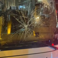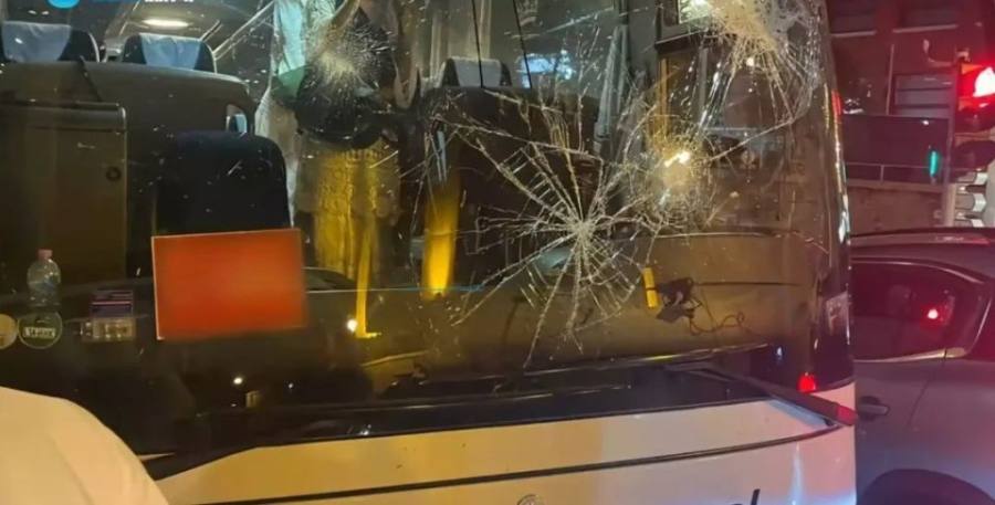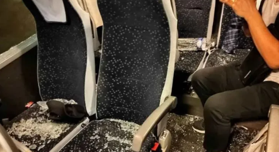 视频画面显示,大巴车挡风玻璃被砸碎,侧面玻璃也大部分缺失。