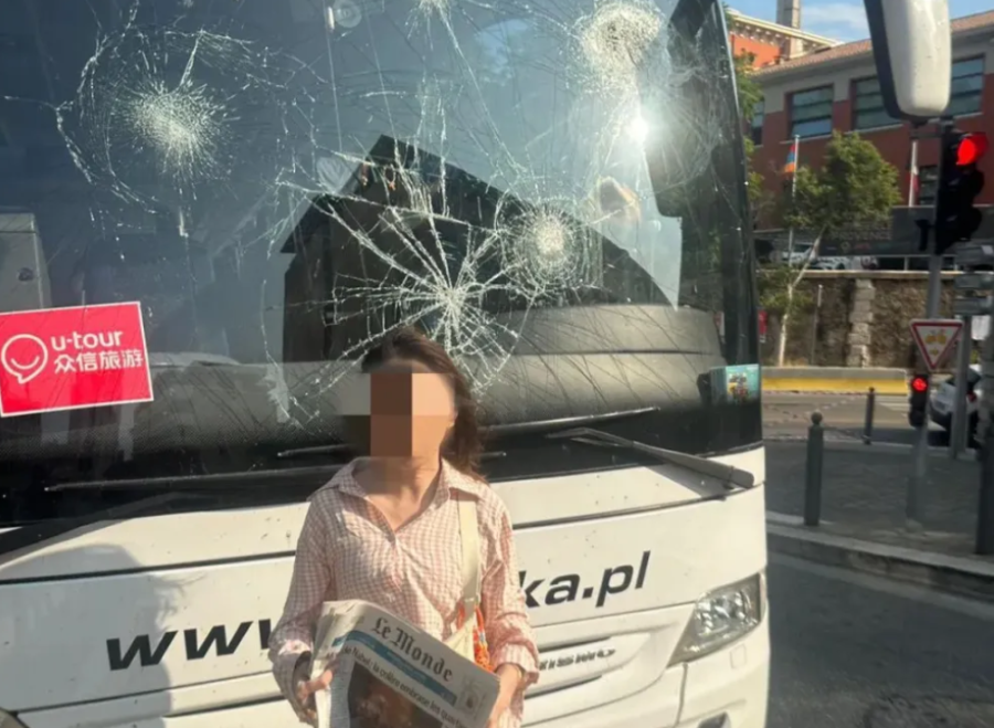 视频拍摄者称,一辆载有41名中国公民的大巴在法国马赛遭十几名黑衣人袭击,有人被砸伤,黑衣人还试图上车把乘客拉下去。