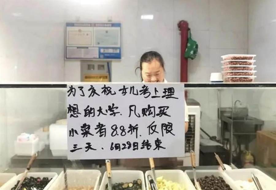 无需怀疑,这家人一开始的确只是想跟熟人街坊老顾客分享一下自己的喜悦,他们并没有多么高调的广而告之,只是在自家经营的凉菜摊挂出了一个打折通知,也并没有写明女儿考上了哪所好大学,只说女儿考上了理想的大学,三天打8.8折,也不是什么惊人的折扣,主打一个分享喜悦,一起庆祝。