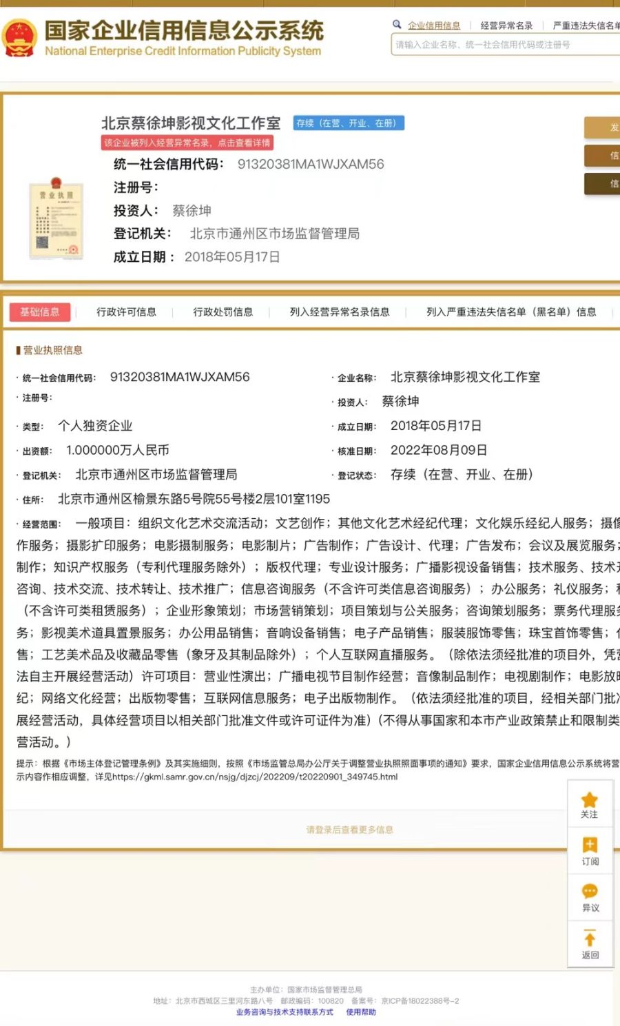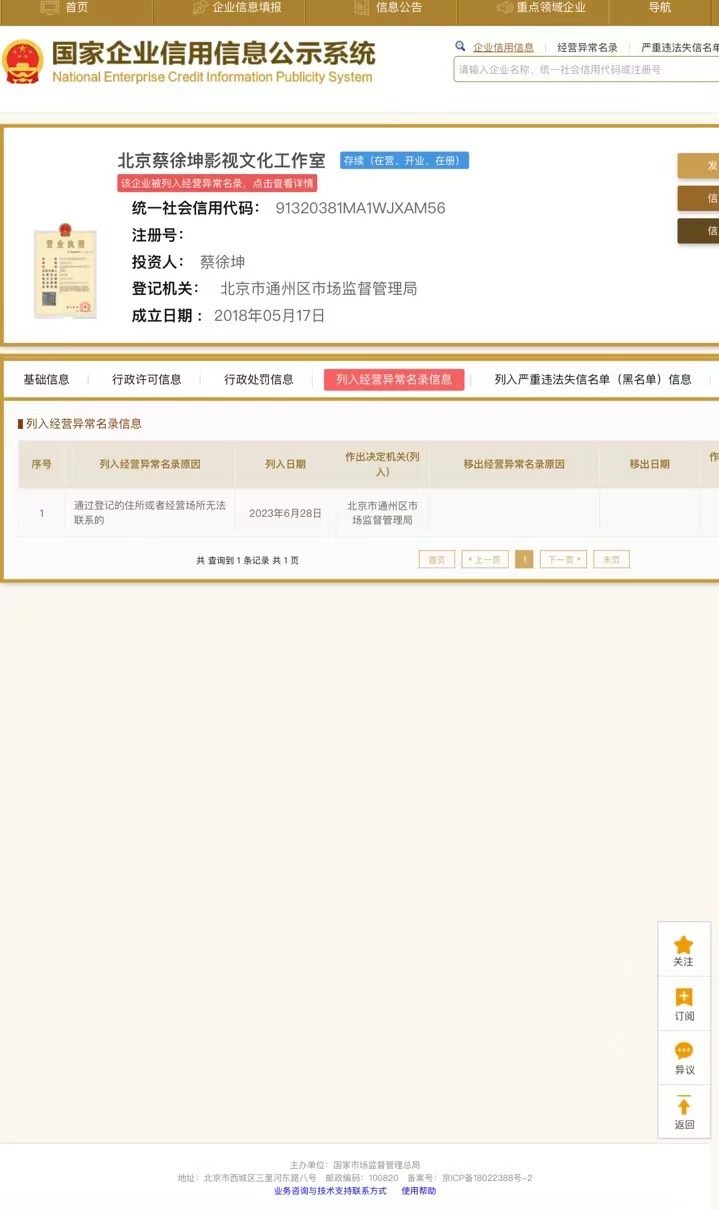 公开信息显示,6月28日,北京市通州区市场监督管理局因“通过登记的住所或者经营场所无法联系”,将北京蔡徐坤影视文化工作室列入经营异常名录。