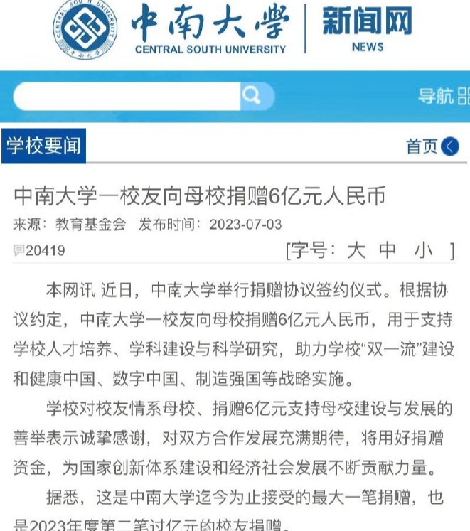 中南大学一校友向母校捐赠6亿元,迄今最大一笔