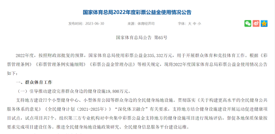 6月30日,国家体育总局官网发布《国家体育总局2022年度本级彩票公益金使用情况公告》(以下简称《公告》),公布了国家体育总局2022年度本级彩票公益金使用情况。