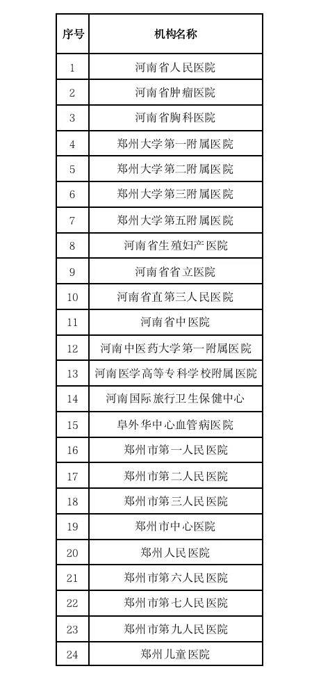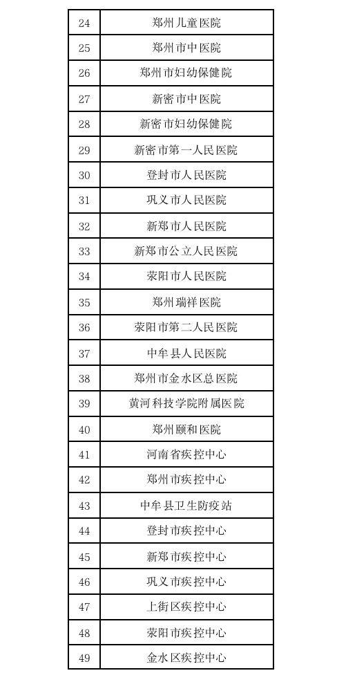 主要包括河南省疾病预防控制中心、河南省人民医院、河南省省立医院、河南省胸科医院、河南省直第三人民医院、河南省中医院、郑州大学第三附属医院、郑州大学第一附属医院、郑州儿童医院、郑州人民医院、郑州市第二人民医院、郑州市第六人民医院、郑州市第七人民医院、郑州市第三人民医院、郑州市第十六人民医院、郑州市第一人民医院、郑州市中心医院、郑州市中医院、登封市人民医院、登封市中医院、新密市第一人民医院、新密市妇幼保健院、新密市中医院、新郑市公立人民医院、新郑市人民医院解放路院区和人民路院区、郑州瑞祥医院、荥阳市疾病预防控制中心、中牟县卫生防疫站。