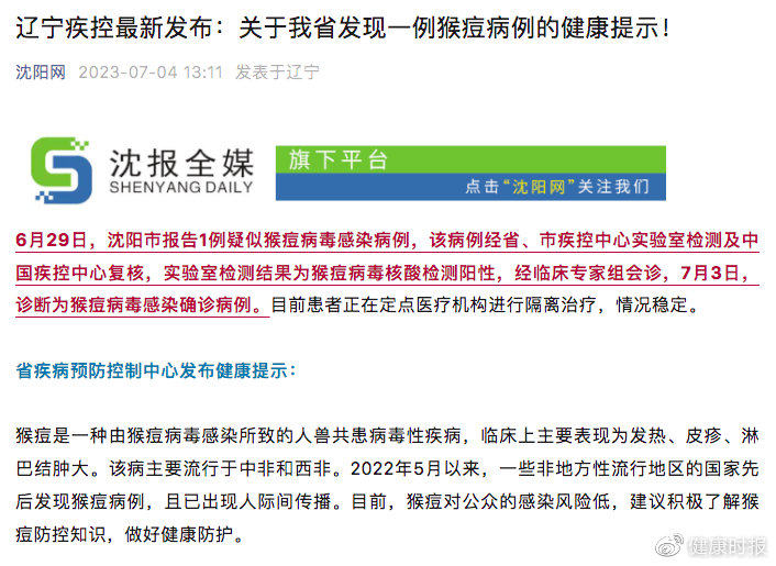 6月29日,辽宁省沈阳市报告1例疑似猴痘病毒感染病例,该病例经省、市疾控中心实验室检测及中国疾控中心复核,实验室检测结果为猴痘病毒核酸检测阳性,经临床专家组会诊,7月3日,诊断为猴痘病毒感染确诊病例。目前患者正在定点医疗机构进行隔离治疗,情况稳定。