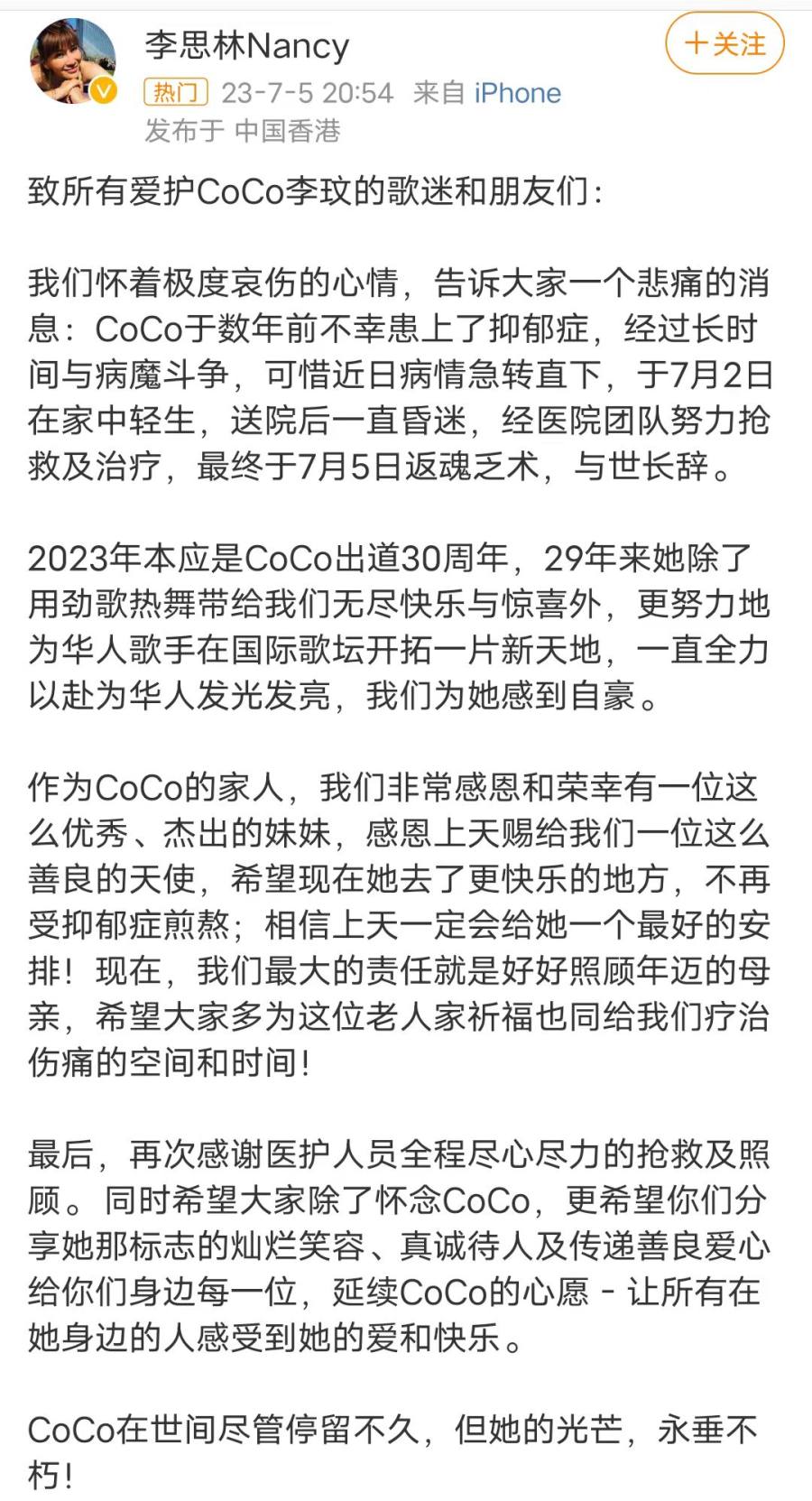 7月5日晚,李玟的姐姐李思林Nancy在社交媒体上透露,7月2日,歌手李玟因抑郁症在家中轻生,于2023年7月5日经抢救无效去世,年仅48岁。