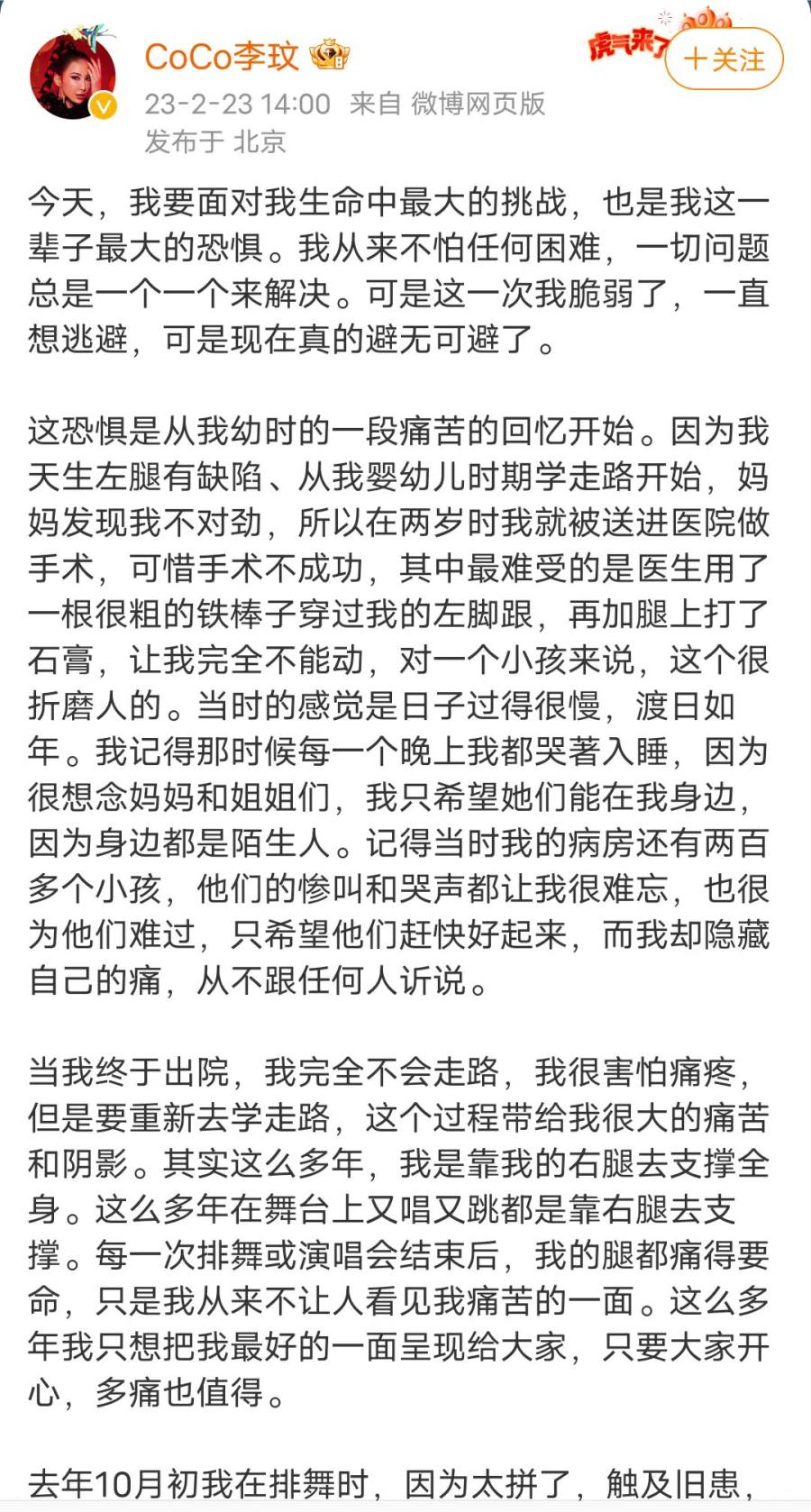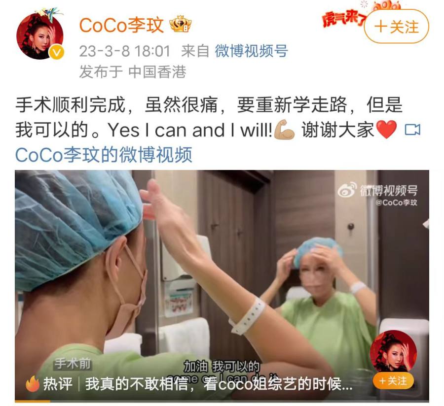 十几天后,李玟顺利完成了一次手术,“虽然很痛,要重新学走路,但是我可以的。”