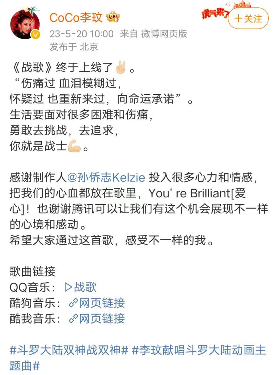 李玟的最后一条微博是5月20日发布的,分享的是新歌《战歌》上线了,歌词写道:“伤痛过 血泪模糊过 怀疑过 也重新来过 向命运承诺 泪落 眼神不落魄 全力 以赴去拼搏 去 守护这脉搏”。