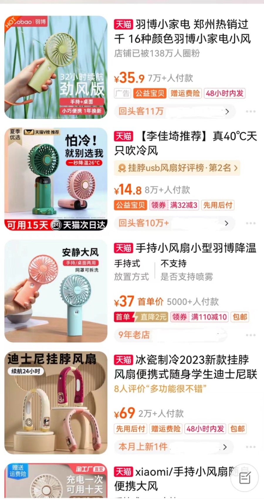 打开商品界面,了解到这款风扇售价35.9元-69元不等,据客服介绍,小风扇主打耐用、易携带、噪音低,既有手持款,又有桌面款。该产品仅评论就有5万多条:“夏日必备神器,总体非常满意”“看很多人推荐买的,性价比真的很高!”“一次性买了两个,价格实惠,声音能接受”……